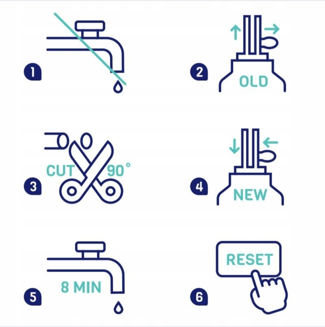 5. Installeer het nieuwe filter: steek de slang ongeveer 2 cm diep in en zet de pinnen vast.